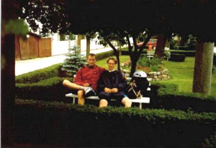 ![]() | Ta sama ławka tylko tu jesteśmy razem. Jedno z niewielu zdjęć gdzie jesteśmy razem. A zrobił je facet, który akurat był na spacerze z psem mordercą. Poprosiliśmy go aby pstryknął i w momencie gdy się przymierzał do pstryknięcia zobaczyliśmy, że przysłona nie jest odsłonięta. Rzuciliśmy się razem aby ją odsłonić i w tym momencie usiedliśmy z powrotem gdyż jego pies rzucił się na nas. Facet w ostatniej chwili go przytrzymał. |